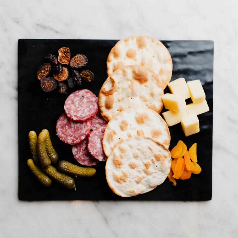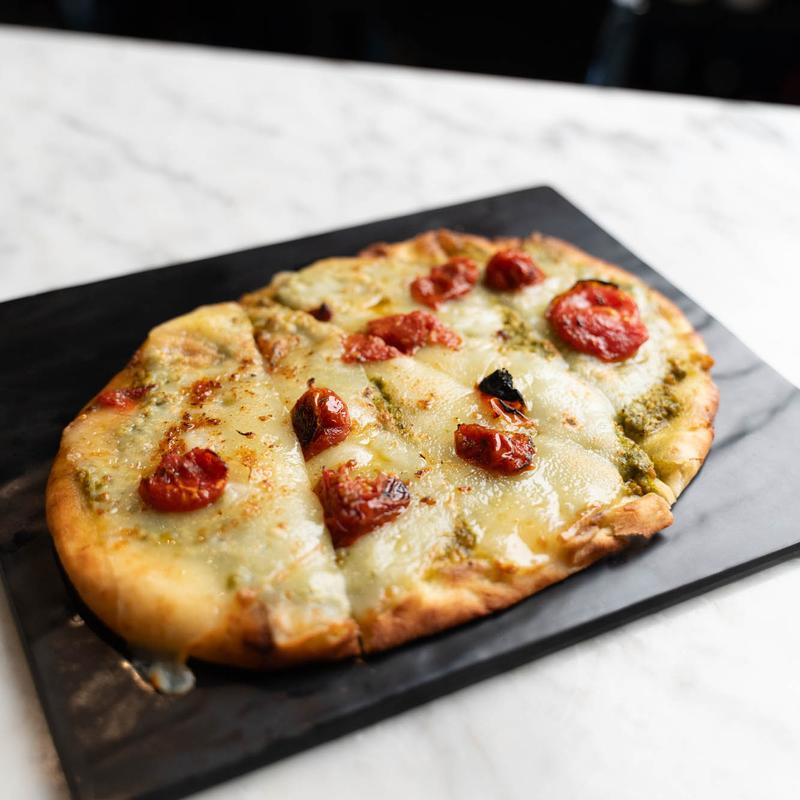 Pesto, cream cheese, ham, salami, pepperoni, provolone, greens, roasted tomatoes, peppers, goat cheese