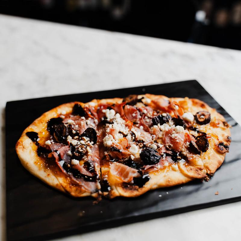 Our house chicken with Frog's Spit BBQ, bacon, caramelized onions, and goat cheese