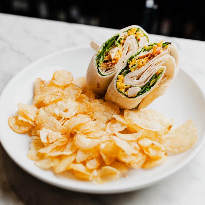 Chicken, bacon, cheddar, greens, ranch, wrapped into a tortilla